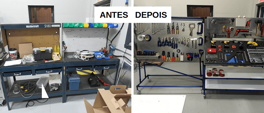 A work area before it was organised and after a 5S event is completed. Things are much cleaner and can be found more easily - txm.com/lean-begins-with-housekeeping
