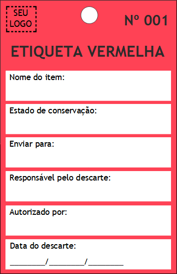 Todo material enviado para a Área de Descarte deverá ser etiquetado com a Etiqueta de Descarte, também conhecida como Etiqueta Vermelha, um formulário que fornece informações importantes que ajudam na rastreabilidade e destinação do material. Modelo de etiqueta de descarte: