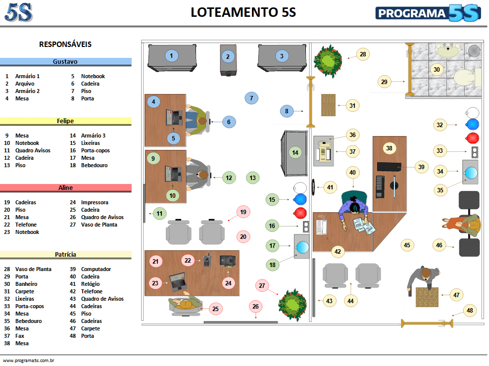 Loteamento 5S é um documento usado para identificar a localização dos principais objetos e os respectivos responsáveis pela limpeza e organização das áreas.